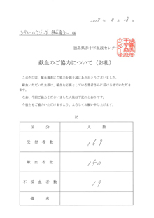 今年度はボランティア含め総勢239名の方がご参加下さいました。そのうち169名の方にエントリーしていただき、150名の方に献血を行っていただきました。