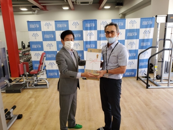 この度、四国大学 強化指定スポーツ部への活動支援として、ポカリスエット(1.5L)71箱の寄附を行い、令和2年8月18日、四国大学スポーツ健康館において贈呈式が執り行われました。