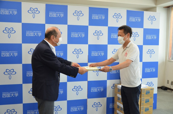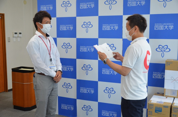 四国大学本館にて贈呈式を実施、新型コロナウイルス感染症対策のため入構できない学生選手の代わりに、男子ソフトテニス部 黒羽 祥平 監督へ目録をお渡しし、佐野事務局長より感謝状を頂きました。