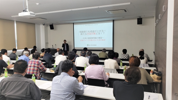 第二部は弊社経営戦略室 部長の川角より、「閑散期でも収益が上がる新たな空室対策」と題しまして、現在の賃貸業界の大きな動きから、今後の収益チャンスとなる着目するべき点など、今大きく変わりつつある賃貸業界の現状をご報告させていただきました。