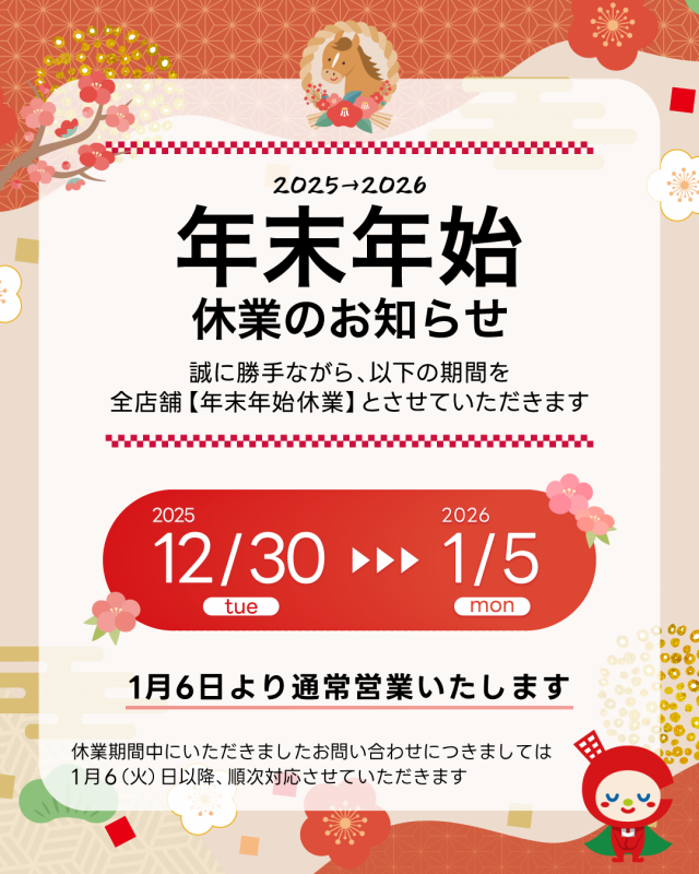 ※休業期間中にいただきましたお問い合わせにつきましては、1月6日(火)より順次ご対応させていただきます。